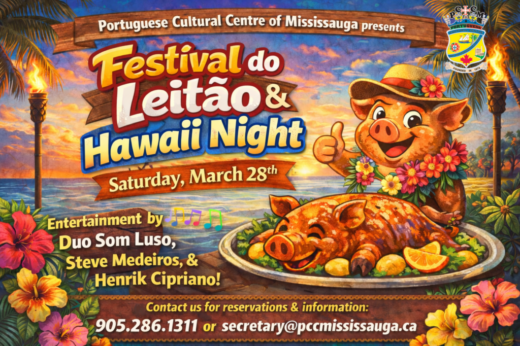 Join us at the Portuguese Cultural Centre of Mississauga for a fun and delicious evening as we bring together the flavours of Portugal with a tropical Hawaiian twist. Enjoy our famous leitão (roast pig) in a festive atmosphere filled with great food, great company, and plenty of island-inspired fun.